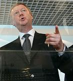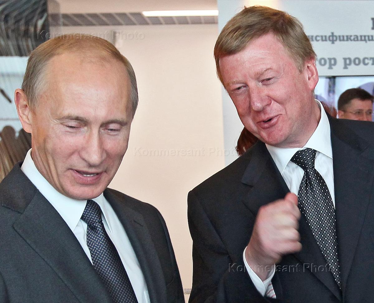 Генеральный директор ГК "Российская корпорация нанотехнологий" ("Роснано") Анатолий Чубайс во время посещения председателем правительства России Владимиром Путиным выставки, организованной ГК "Роснанотехнологии".