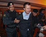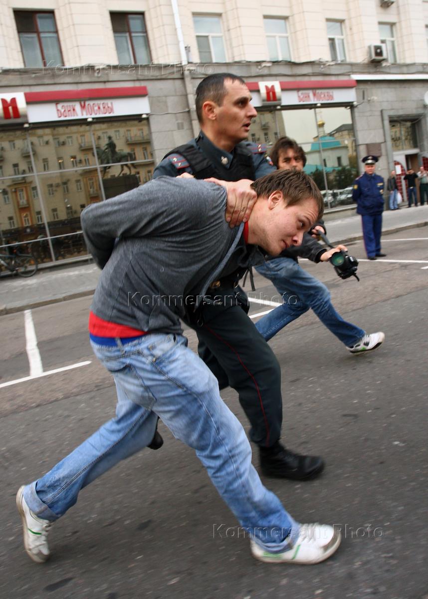 Гей-активист Николай Алексеев (справа) во время задержания после пикета гей-активистов против мэра Москвы Юрия Лужкова у мэрии Москвы.