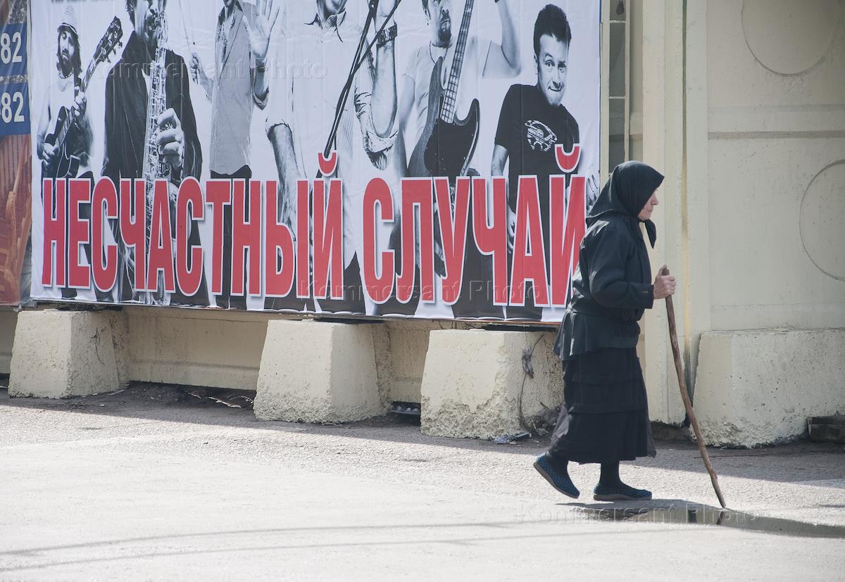 Жанровая фотография. Пожилая женщина с палочкой проходит мимо банера с рекламой концерта группы "Несчастный случай".