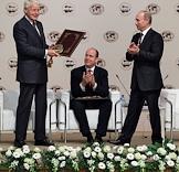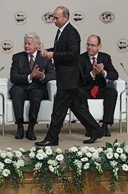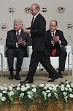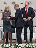 Председатель правительства России Владимир Путин (в центре) и князь Монако Альбер II (справа) во время работы Международного Арктического форума "Арктика - территория диалога". Форум прошел в Московском государственном университете (МГУ) имени М.В.Ломоносова.