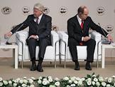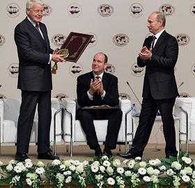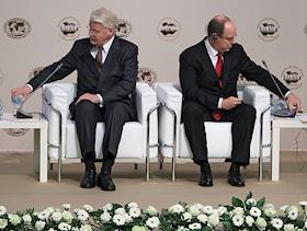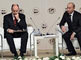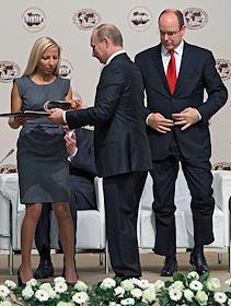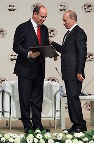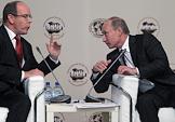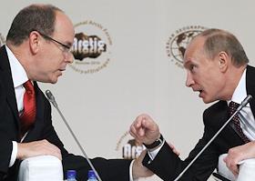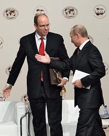 Князь Монако Альбер II (слева) и председатель правительства России Владимир Путин (справа) во время работы Международного Арктического форума "Арктика - территория диалога". Форум прошел в Московском государственном университете (МГУ) имени М.В.Ломоносова.