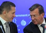 Министр природных ресурсов и экологии России Юрий Трутнев (слева) и первый заместитель председателя правительства России Виктор Зубков (справа) на заседании круглого стола по развитию лесоперерабатывающей промышленности.