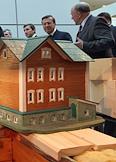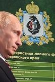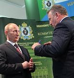Председатель правительства России Владимир Путин (слева) и губернатор Хабаровского края Вячеслав Шпорт (справа) на выставке "Лесдревмаш 2010" в "Экспоцентре".