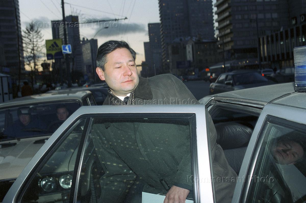 Communications Minister Leonid Reiman is getting in his car on the way to a press conference at Ekho Moskvy radio station.