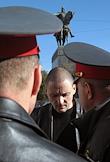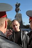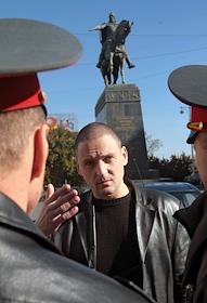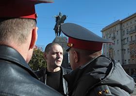 Координатор движения "Левый фронт" Сергей Удальцов (в центре) во время акции с требованием встречи с исполняющим обязанности мэра Москвы Владимиром Ресиным и согласования проведения Дня Гнева в заявленном месте - на Тверской площади у памятника Юрию Долгорукому.