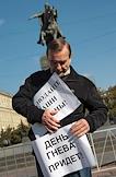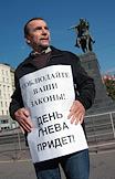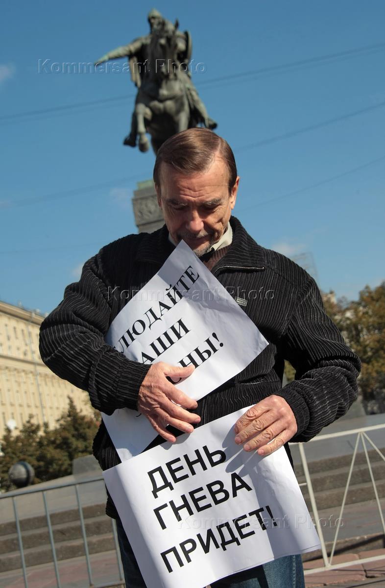 Исполнительный директор движения "За права человека" Лев Пономарев во время акции с требованием встречи с исполняющим обязанности мэра Москвы Владимиром Ресиным и согласования проведения Дня Гнева в заявленном месте - на Тверской площади у памятника Юрию Долгорукому.