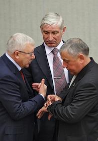 Слева направо: первый заместитель председателя Государственной думы (ГД) России Олег Морозов, член комитета ГД по промышленности Николай Рябов и первый заместитель председателя комитета ГД по аграрным вопросам Николай Харитонов на заседании Госдумы.