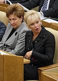 Заместитель председателя комитета Государственной думы (ГД) России по бюджету и налогам Галина Карелова (слева) и член комитета ГД по охране здоровья Татьяна Яковлева (справа) на заседании Госдумы.