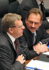 Заместитель председателя правительства России, министр финансов Алексей Кудрин (слвеа) и заместитель председателя Совета Федерации России Александр Торшин(справа) в Совете Федерации на парламентских слушаниях "О прогнозе социально-экономического развития Российской Федерации до 2013 года и параметрах проекта федерального бюджета на 2011 год и на плановый период 2012 и 2013 годов".