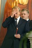 Президент России Владимир Путин (слева), председатель Совета Федерации Сергей Миронов (в центре) и мэр Москвы Юрий Лужков (справа) во время праздничного богослужения в пасхальную ночь в храме Христа Спасителя, которое возглавил патриарх Московский и всея Руси Алексий II.