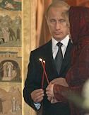 Президент России Владимир Путин во время праздничного богослужения в пасхальную ночь в храме Христа Спасителя, которое возглавил патриарх Московский и всея Руси Алексий II.
