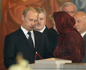 Президент России Владимир Путин (слева), председатель Совета Федерации Сергей Миронов (в центре) и мэр Москвы Юрий Лужков (справа) во время праздничного богослужения в пасхальную ночь в храме Христа Спасителя, которое возглавил патриарх Московский и всея Руси Алексий II.