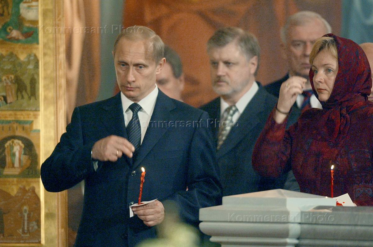 Президент России Владимир Путин (слева) с женой Людмилой (справа) и председатель Совета Федерации Сергей Миронов (в центре) во время праздничного богослужения в пасхальную ночь в храме Христа Спасителя, которое возглавил патриарх Московский и всея Руси Алексий II.