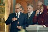 Президент России Владимир Путин во время праздничного богослужения в пасхальную ночь в храме Христа Спасителя, которое возглавил патриарх Московский и всея Руси Алексий II.