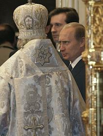 Президент России Владимир Путин (справа) во время праздничного богослужения в пасхальную ночь в храме Христа Спасителя, которое возглавил патриарх Московский и всея Руси Алексий II (слева).