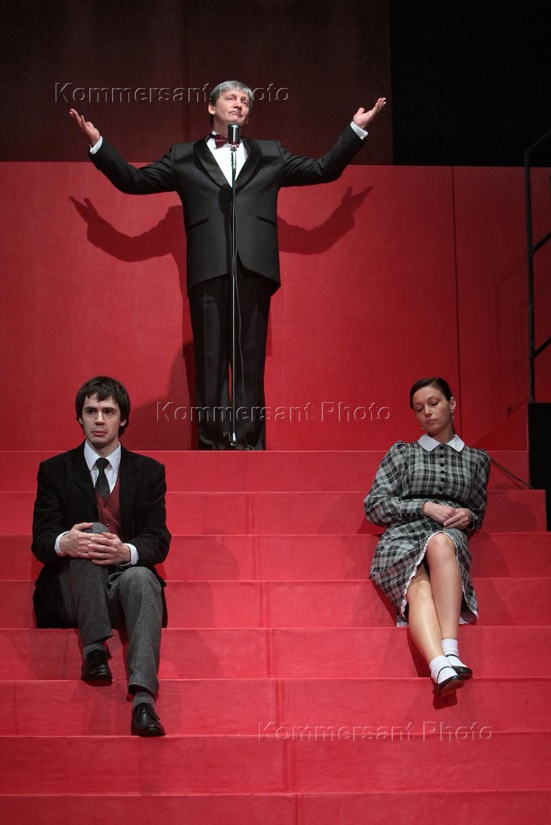 Актеры Александра Урсуляк и Виктор Вержбицкий во время пресс-прогона спектакля "Турандот" в постановке режиссера Константина Богомолова на сцене Московского драматического театра им. А.С. Пушкина.