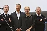 Слева направо: директор по развитию центра Помпиду Бернар Блистен, председатель совета директоров "Капитал Групп" Владислав Доронин, директор Московского дома фотографии Ольга Свиблова и французский художник Бен Вотье на церемонии открытия нового здания Дома фотографии, Мультимедийного комплекса актуальных искусств, Multimedia Art Museum Mosсow (МАММ).