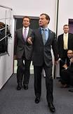 Губернатор штата Калифорния Арнольд Шварценеггер (слева) и президент России Дмитрий Медведев (в центре) во время встречи в школе управления "Сколково".