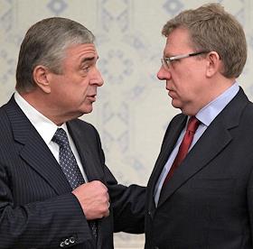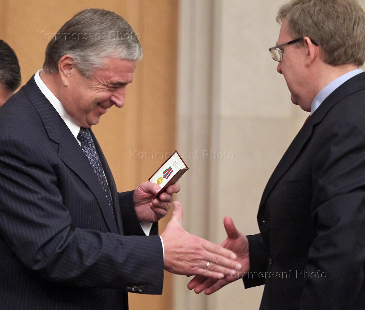 Госсекретарь Союза России и Белоруссии Павел Бородин (слева) и заместитель председателя правительства России, министр финансов Алексей Кудрин (справа) перед началом встречи глав правительств стран-участниц Таможенного союза. Встреча прошла в "Президент-отеле".