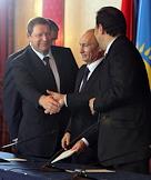Госсекретарь Союза России и Белоруссии Павел Бородин (слева) и первый заместитель председателя правительства России Игорь Шувалов (справа) перед началом встречи глав правительств стран-участниц Таможенного союза. Встреча прошла в "Президент-отеле".