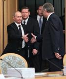 Слева направо: председатель правительства России Владимир Путин, премьер-министр Белоруссии Сергей Сидорский, руководитель протокола председателя правительства России, заместитель руководителя аппарата правительства России Антон Вайно и госсекретарь Союза России и Белоруссии Павел Бородин перед началом пресс-конференции по итогам встречи глав правительств стран-участниц Таможенного союза. Встреча прошла в "Президент-отеле".