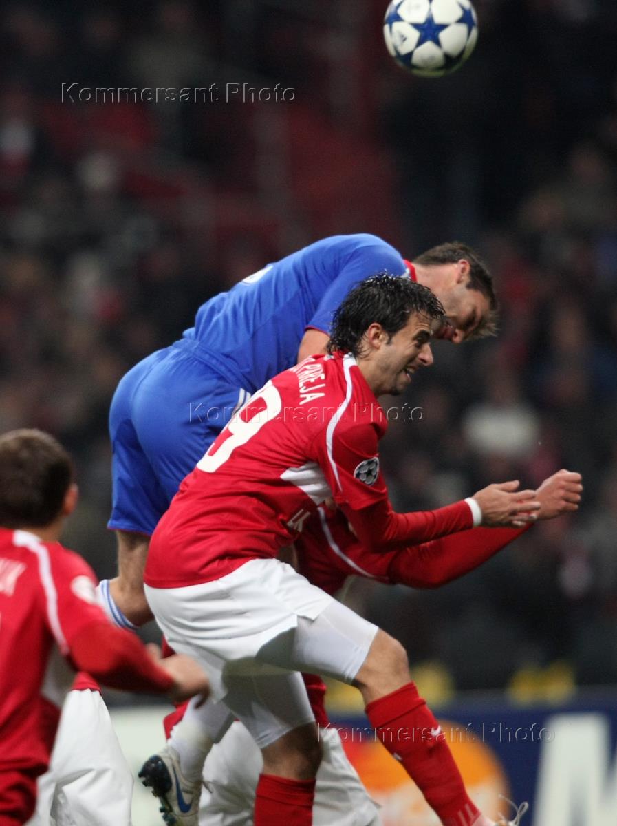 Лига Чемпионов УЕФА 2010-2011. Матч между командами "Спартак" (Россия) – "Челси" (Англия). Полузащитник команды "Спартак" Баррето Да Силва (слева) и полузащитник команды "Челси" Юрий Жирков (справа) во время матча.