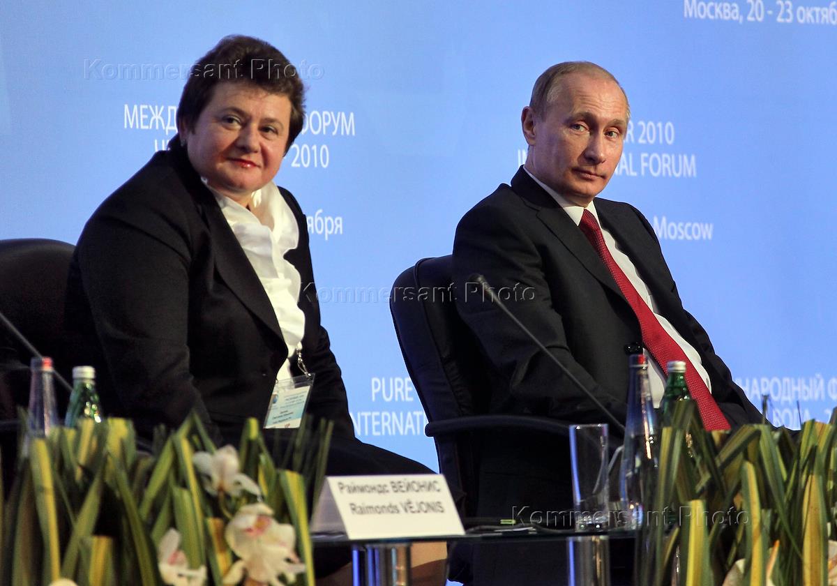 Заместитель председателя Совета Федерации России Светлана Орлова (слева) и председатель правительства России Владимир Путин (справа) на открытии Международного форума "Чистая вода 2010". Форум прошло в Экспоцентре.
