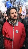 Митинг оппозиции с требованиями отставки правительства, роспуска обеих палат парламента, проведения досрочных свободных выборов, радикального обновления личного состава милиции и спецслужб прошел на Пушкинской площади. Участник митинга со "спецсигналом" на голове.
