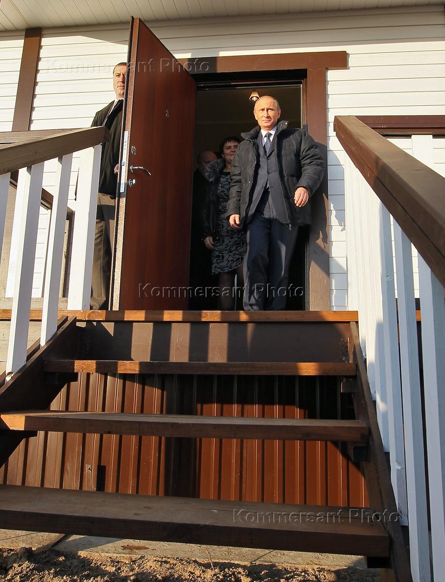 Председатель правительства России Владимир Путин (справа) во время инспекции работ по восстановлению жилья, уничтоженного во время природных пожаров, в деревне Верхняя Верея Выксунского района Нижегородской области.