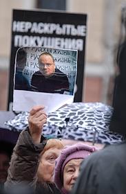 Митинг против политического террора, приуроченный к годовщине нападения на главного редактора газеты "Химкинская правда" Михаила Бекетова, прошел на Чистых прудах у памятника Александру Грибоедову.
