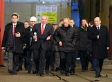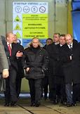Рабочая поездка председателя правительства России Владимира Путина в Уральский федеральный округ. Генеральный директор ОАО "Корпорация ВСМПО-АВИСМА" Михаил Воеводин (слева), председатель правительства России Владимир Путин (второй слева) и губернатор Свердловской области Александр Мишарин (справа) во время посещения ОАО "Корпорация ВСМПО-АВИСМА".