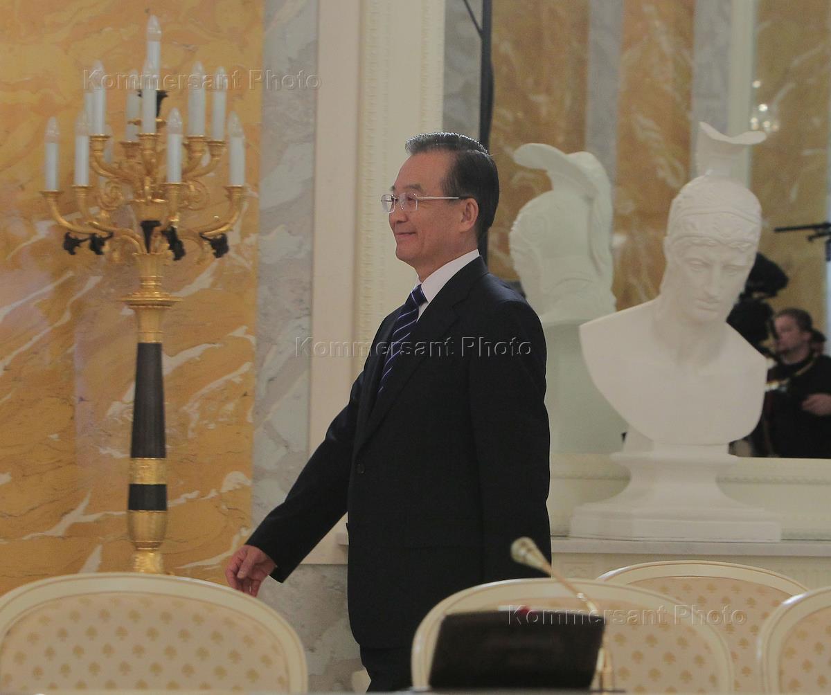 Премьер Государственного совета Китайской Народной Республики (КНР) Вэнь Цзябао (слева) и председатель правительства России Владимир Путин (справа) перед началом церемонии подписания ряда документов по итогам российско-китайских межправительственных переговоров. Церемония прошла в Константиновском дворце.