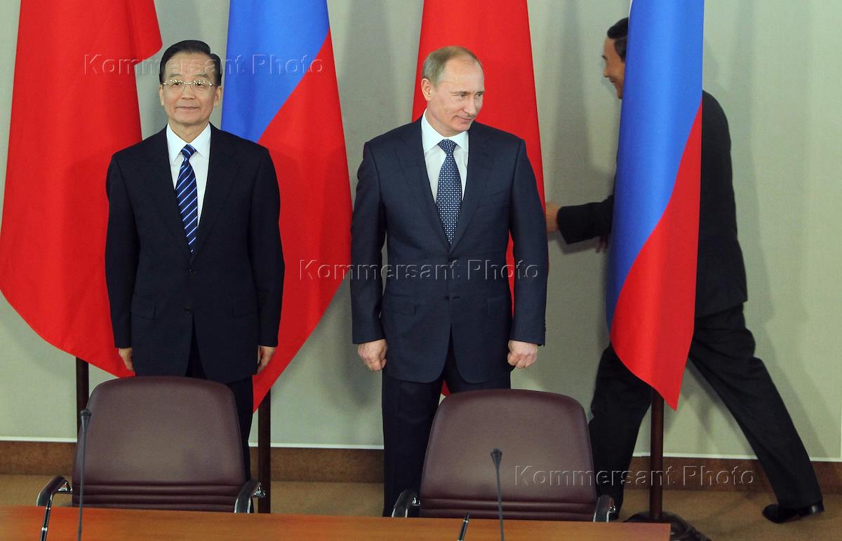Премьер Государственного совета Китайской Народной Республики (КНР) Вэнь Цзябао (справа) и председатель правительства России Владимир Путин (слева) во время церемонии подписания ряда документов по итогам российско-китайских межправительственных переговоров. Церемония прошла в Константиновском дворце.