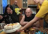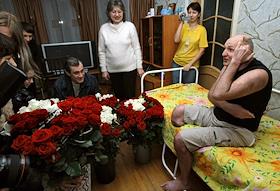 Бывший главный редактор газеты "Химкинская правда" Михаил Бекетов (справа) у себя дома во время вручения ему цветов, организованного Фондом помощи журналисту.