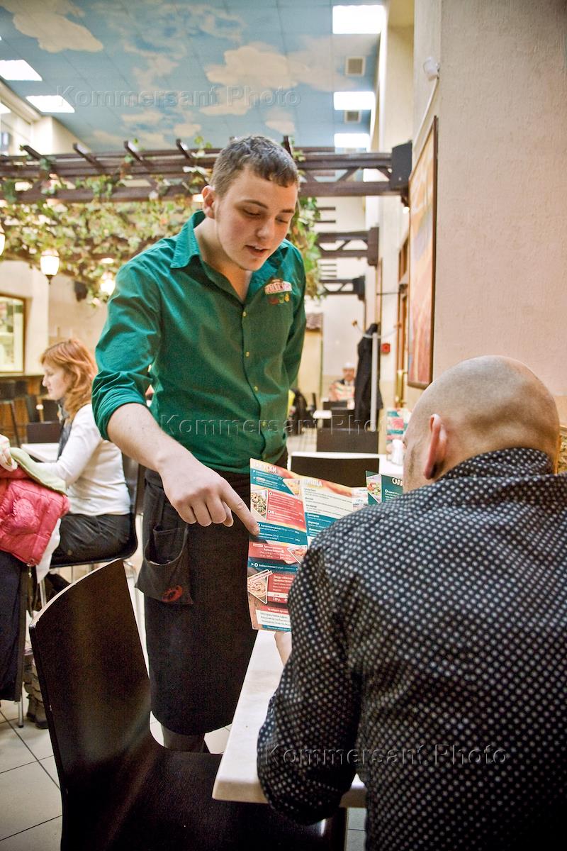 Пиццерия "Папа Джонс". Официант помогает в выборе блюда посетителю ресторана.