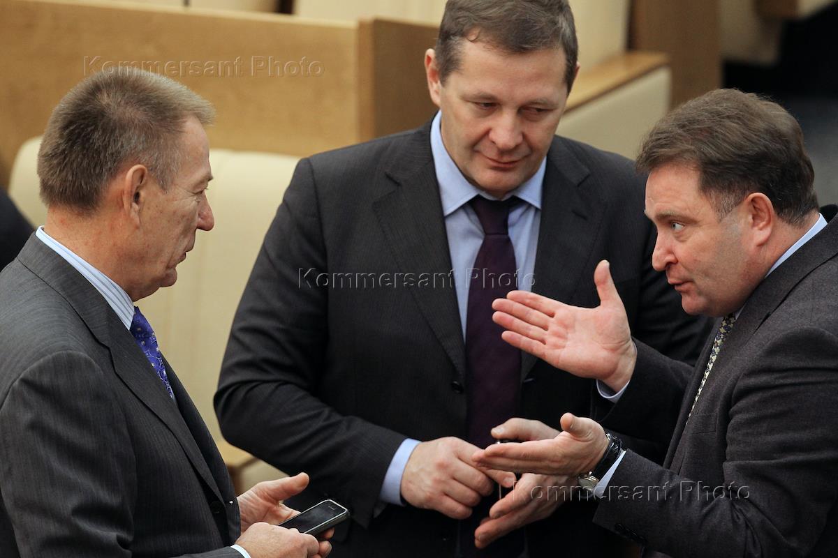 Слева направо: первый заместитель председателя комитета Государственной думы (ГД) России по охране здоровья Николай Герасименко, первый заместитель председателя комитета ГД по безопасности Михаил Гришанков и член комитета ГД по обороне Михаил Ненашев на заседании Госдумы.