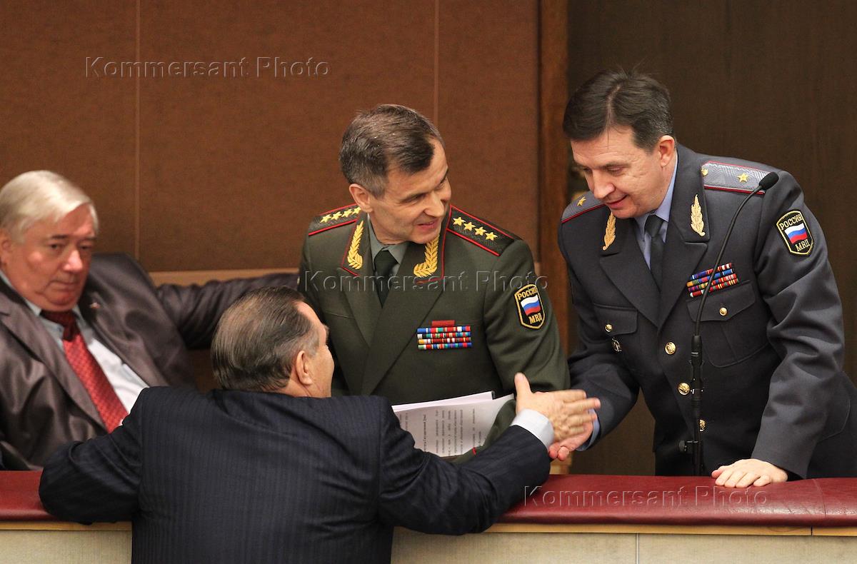 Слева направо: статс-секретарь - заместитель министра внутренних дел России генерал-майор милиции Сергей Булавин, министр внутренних дел России Рашид Нургалиев и представитель президента России в Государственной думе России Гарри Минх на заседании Государственной думы России.