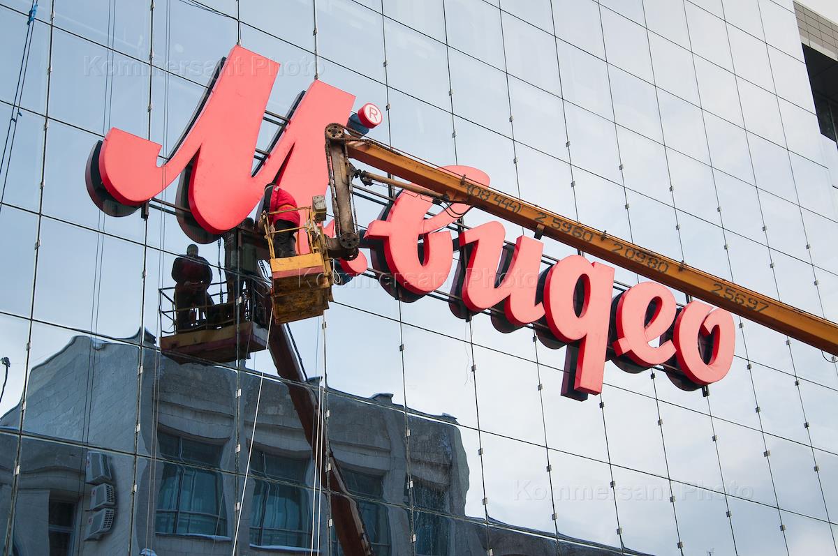 Жанровая фотография. Рабочие вешают вывеску магазина бытовой техники и электроники "М.видео".