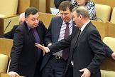 Первый заместитель председателя Государственной думы (ГД) России Олег Морозов (в центре) и председатель комитета ГД России по конституционному законодательству и государственному строительству Владимир Плигин (справа) на заседании Госдумы.