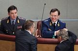 Статс-секретарь - заместитель министра внутренних дел России генерал-майор милиции Сергей Булавин (слева), полномочный представитель правительства России в Государственной думе России Андрей Логинов (второй слева) и первый заместитель генерального прокурора России Александр Буксман (второй справа) на заседании Государственной думы России.