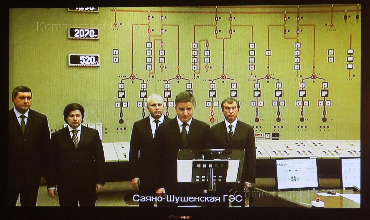 Председатель правления ОАО "РусГидро" Евгений Дод (второй справа) и заместитель председателя правительства России Игорь Сечин (справа) во время телемоста председателя правительства России Владимир Путин с Саяно-Шушенской ГЭС.