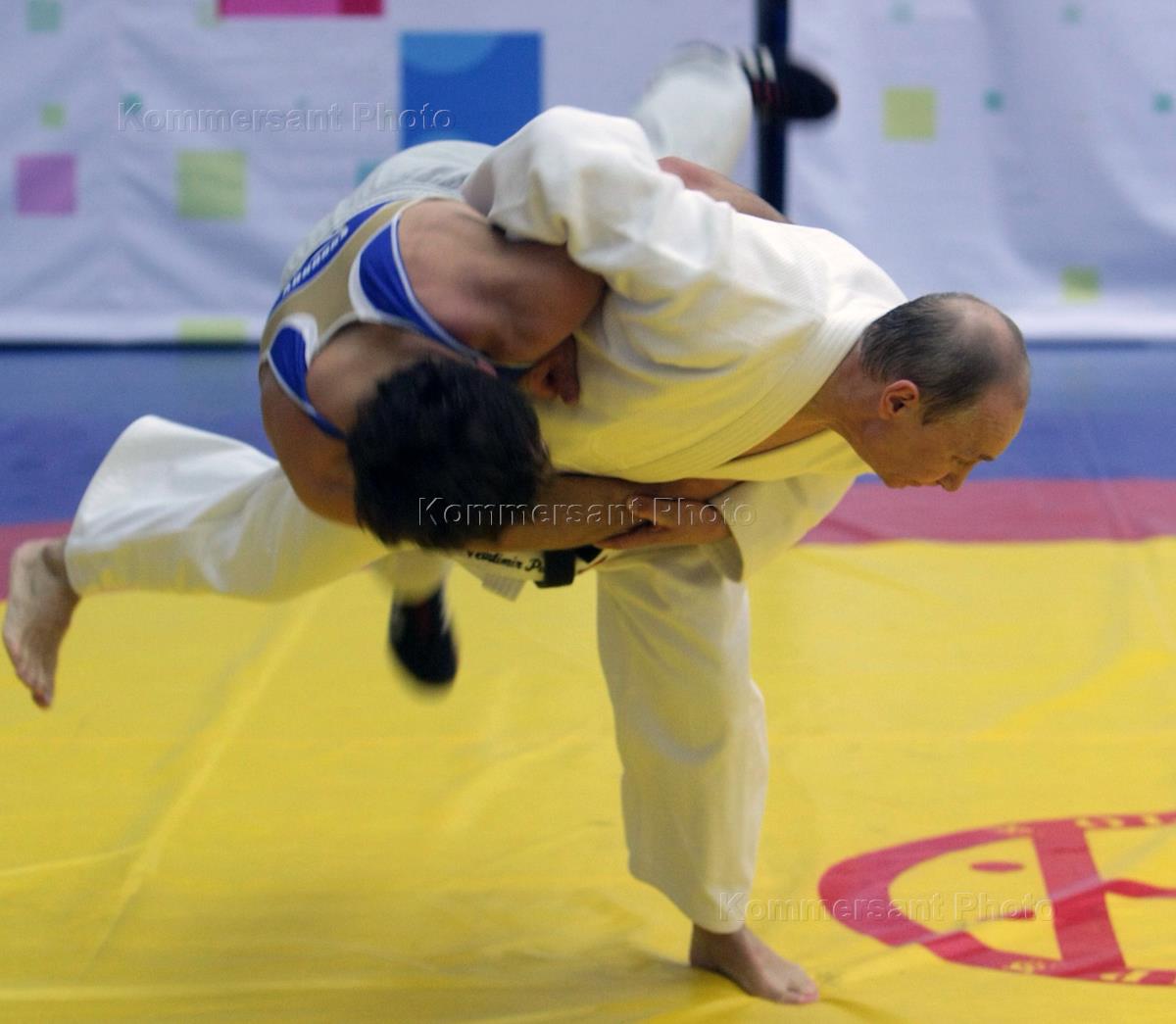 Russian Prime Minister Vladimir Putin (left) during a visit to the sports and recreation complex Moscow took part in joint wrestling, judo and sambo training teams.