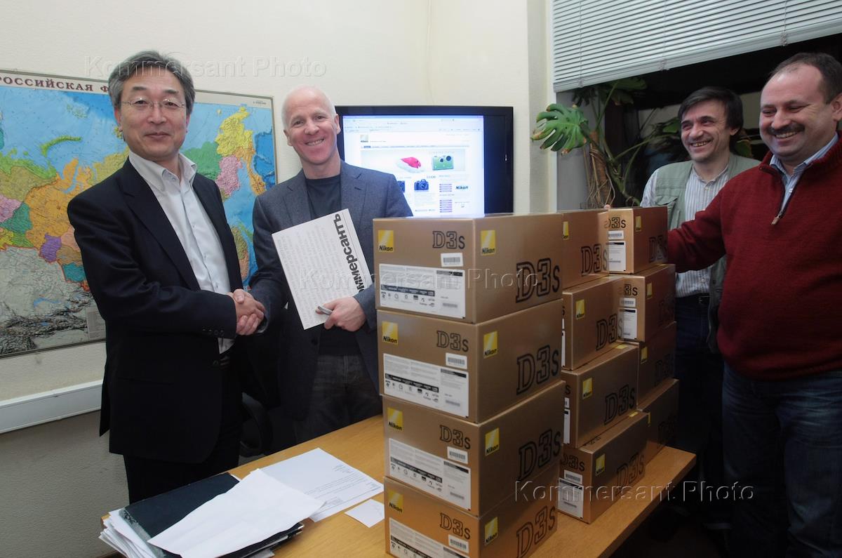 Left to right: Photo service director of the Kommersant publishing house Eddie Opp, director of Nikon in Eastern Europe and CIS Kozhi Noda and technical manager of the Kommersant publishing house photo service Anatoly Sergeyev.