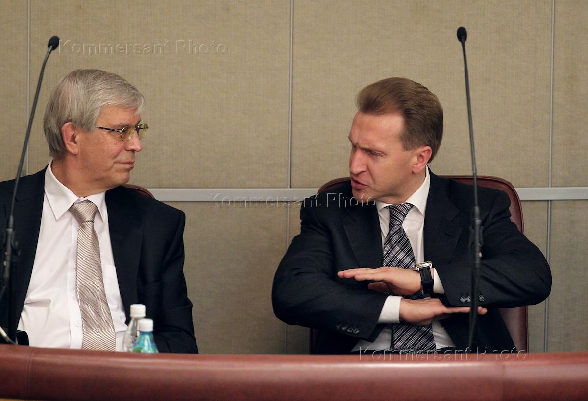 Left to right: Head of the Central Bank of Russia Sergei Ignatiev (left) and the First Deputy Prime Minister of Russia Igor Shuvalov (right) at the plenary session of the Russian State Duma.