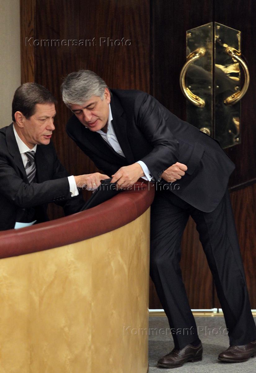 Заместитель председателя правительства России, президент Олимпийского комитета России Александр Жуков (слева) и член комитета Государственной думы России по энергетике Валерий Дарганов (справа) на пленарном заседании Государственной думы России.