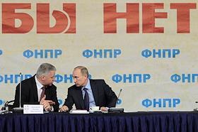 Председатель Федерации независимых профсоюзов России (ФНПР) Михаил Шмаков (слева) и председатель правительства России Владимир Путин (справа) на VII съезде ФНПР. Съезд прошел в пассажирском вагонном депо "Москва-Киевская".