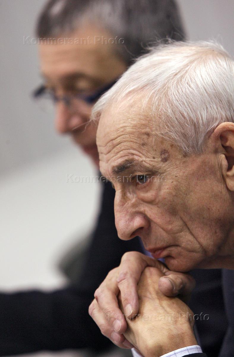 Адвокат Юрий Шмидт (справа) во время пресс-конференции на тему: "Второй судебный процесс Ходорковского и Лебедева. Итоги и перспективы обжалования". Пресс-конференция прошла в центральном офисе агентства "Интерфакс".