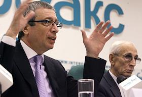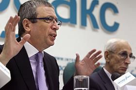 Адвокат Юрий Шмидт (справа) во время пресс-конференции на тему: "Второй судебный процесс Ходорковского и Лебедева. Итоги и перспективы обжалования". Пресс-конференция прошла в центральном офисе агентства "Интерфакс".