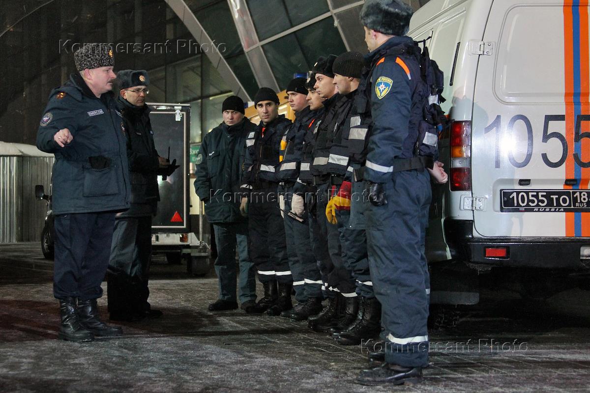 Последствия взрыва в аэропорту "Домодедово". Сотрудники службы спасения у здания аэропорта.