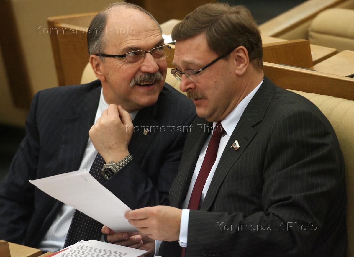 Первый заместитель председателя комитета ГД по международным делам Леонид Калашников (слева) и председатель комитета ГД по международным делам Константин Косачев (справа) на пленарном заседании государственной Думы.